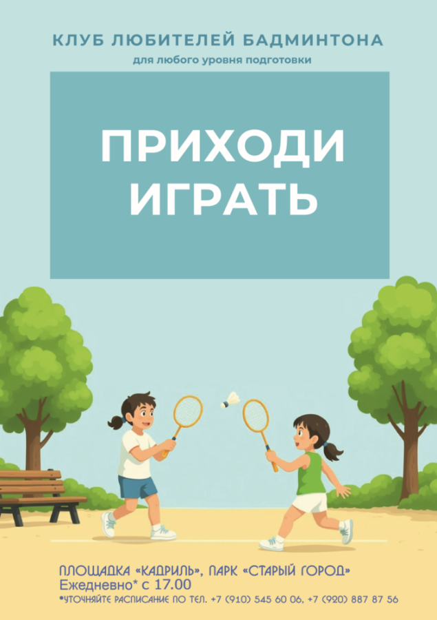 Ежедневно с 17:00 до 22 :00 в Городском парке на площадке «Кадриль» занятия и игры в бадминтон. Возможны корректировки в соответствии с планом общих мероприятий парка.