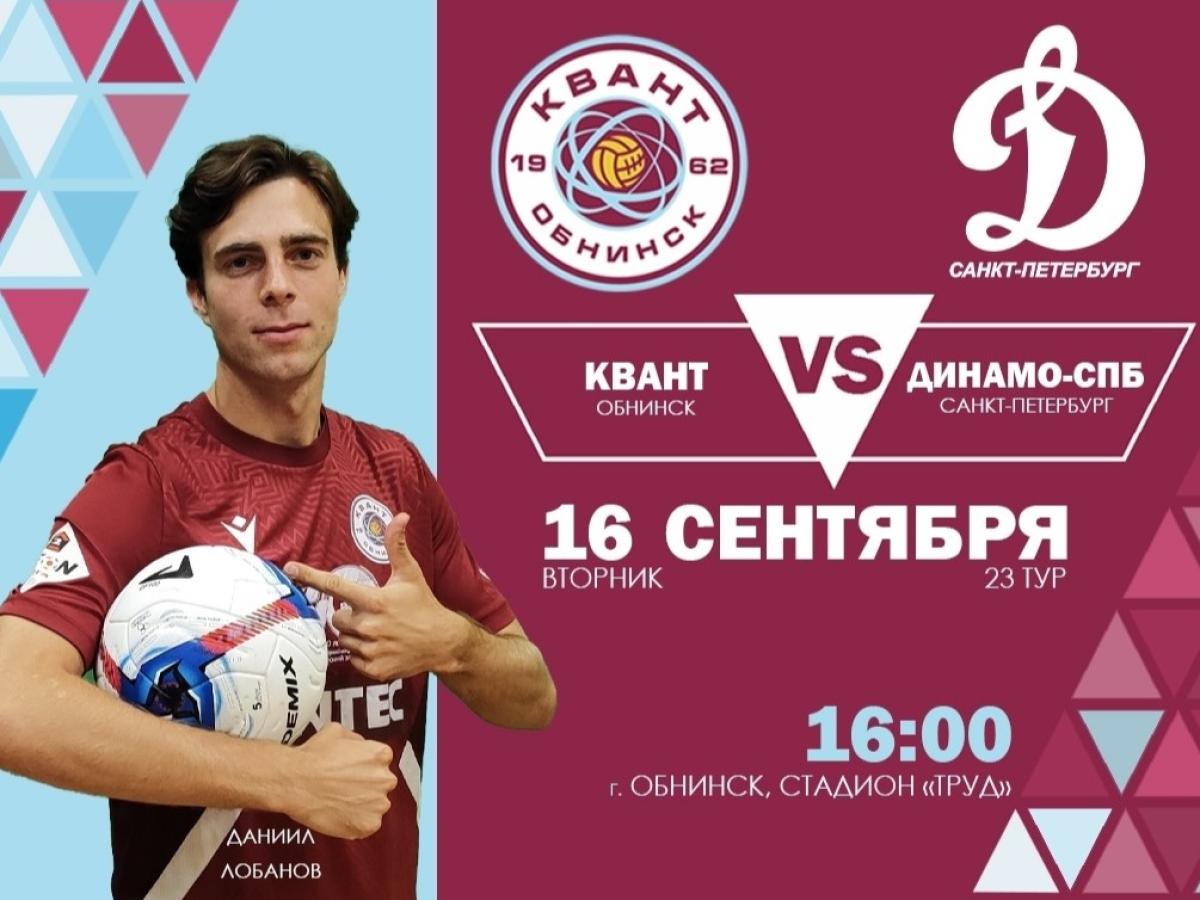 16 сентября 2025 в 17:00 на стадионе «Труд» в Обнинске пройдёт футбольный матч. ФК «Квант» (Обнинск) принимает на домашнем поле команду «Динамо-СПБ» из Санкт-Петербурга.