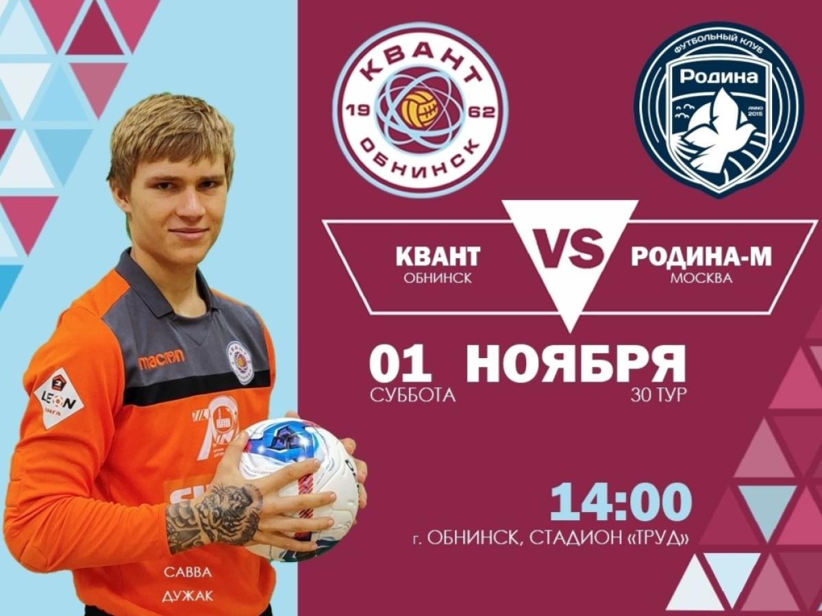 1 ноября 2025 в 14:00 на стадионе «Труд» в Обнинске пройдёт футбольный матч ФК «Квант» (Обнинск) и ФК «Родина-М» (Москва).