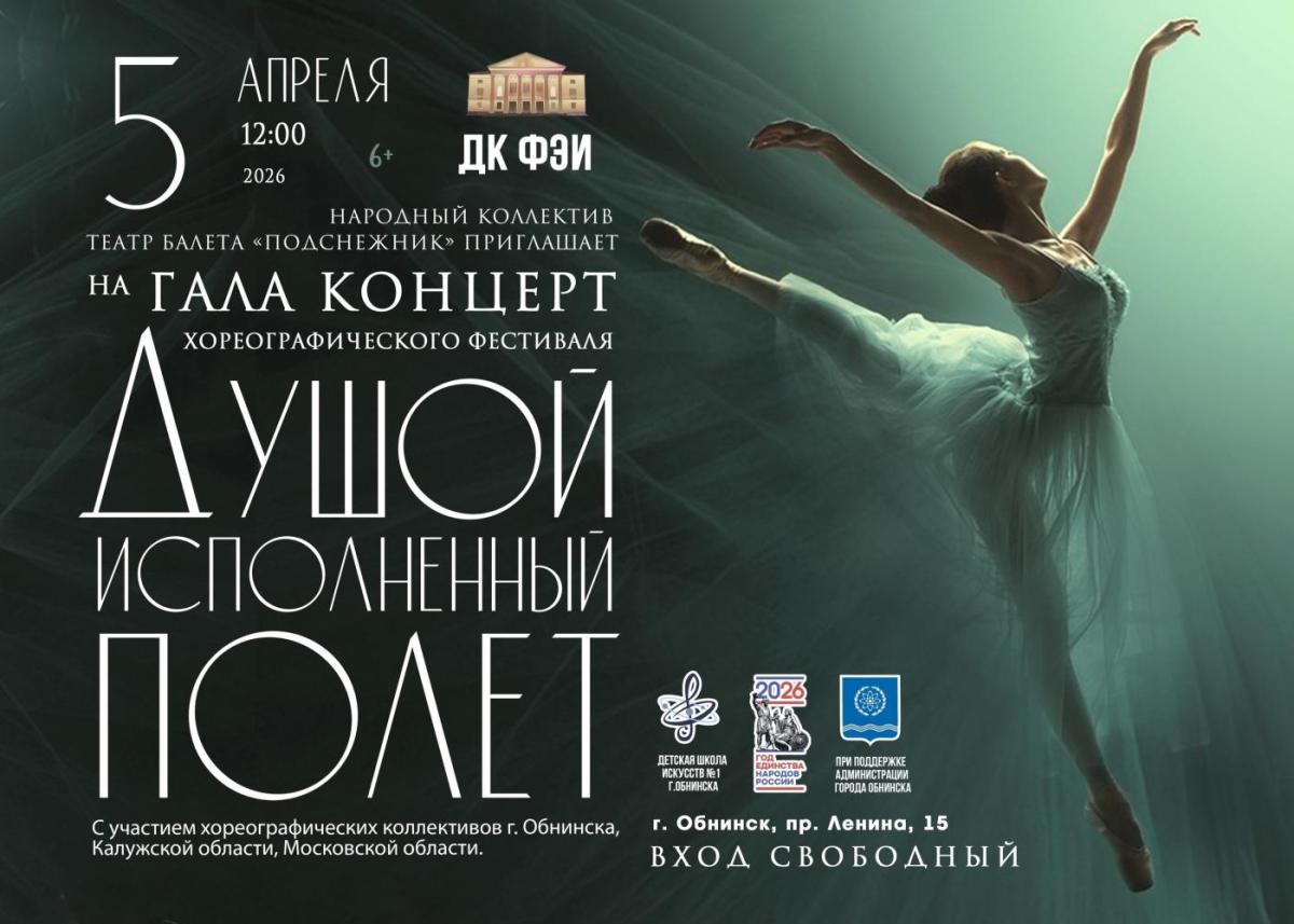5 апреля 2026 в 12:00 в ДК ФЭИ в Обнинске состоится гала‑концерт фестиваля «Душой исполненный полёт». В программе выступления хореографических коллективов из Обнинска, Калужской и Московской областей. Зрители увидят классические балетные номера, современные постановки, яркие ансамблевые и сольные выступления.