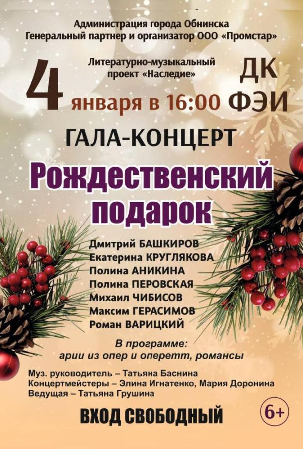 4 января 2026 в 16:00 в ДК ФЭИ состоится традиционный гала-концерт «Рождественский подарок» в рамках музыкального проекта «Наследие». Выступают лауреаты международных конкурсов – солисты Калужской филармонии и оперных театров, а также известные обнинские солисты и музыканты. В программе арии и дуэты из опер и оперетт, русские романсы, инструментальная музыка.
