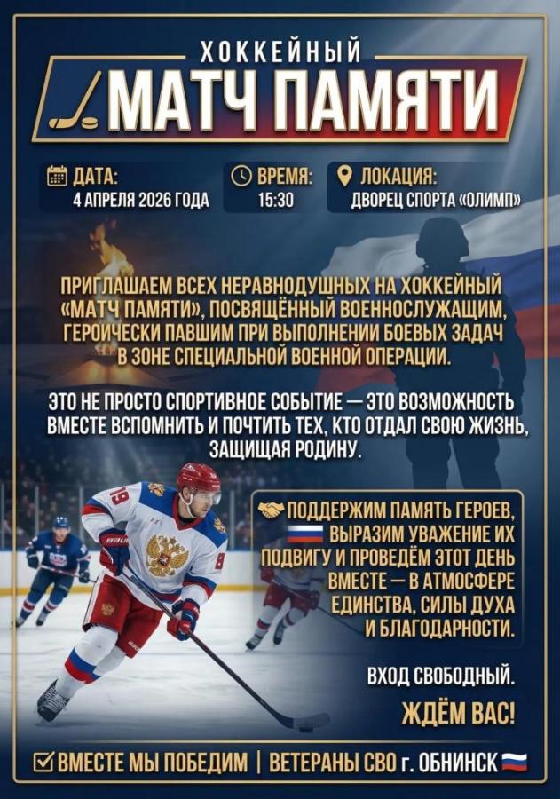 4 апреля 2026 в 15:30 в ДС «Олимп» состоится хоккейный матч, посвящённый военнослужащим, героически павшим при выполнении боевых задач в зоне СВО. Команда «СТП Тим» из Обнинска сразится с командой «Торнадо» из Калуги.