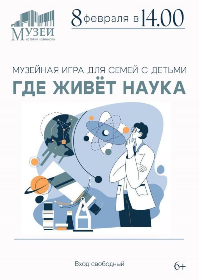 8 февраля 2026 в 14:00 ко Дню российской науки в Музее истории города Обнинска пройдёт игра «Где живет наука?» для семей с детьми.