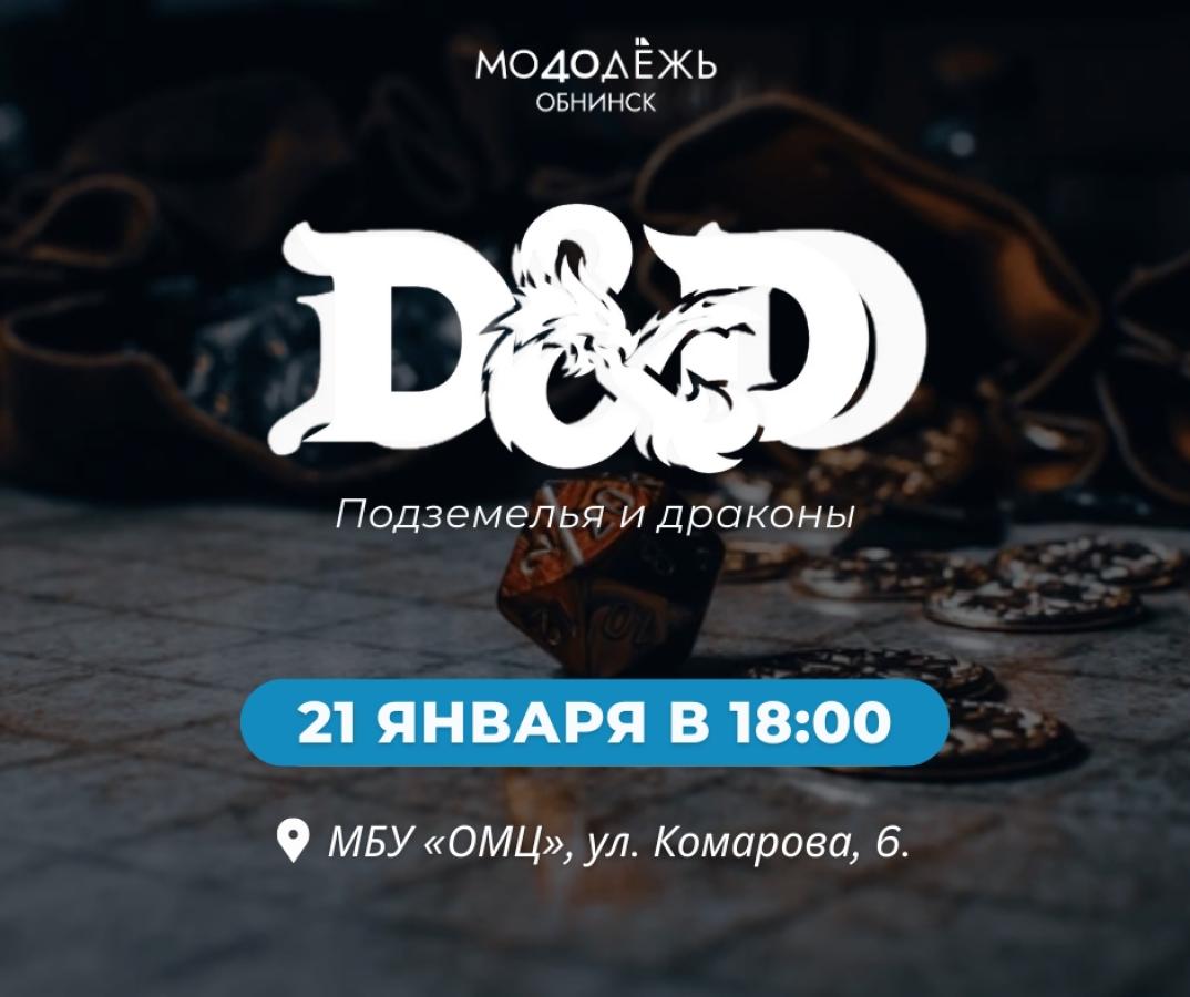 21 января 2026 в 18:00 в ОМЦ пройдёт встреча по настолкам. «Подземелья и драконы» — это легендарная настольная ролевая игра, где ты выбираешь свою судьбу: будь отважным рыцарем, хитрым вором или могущественным волшебником.