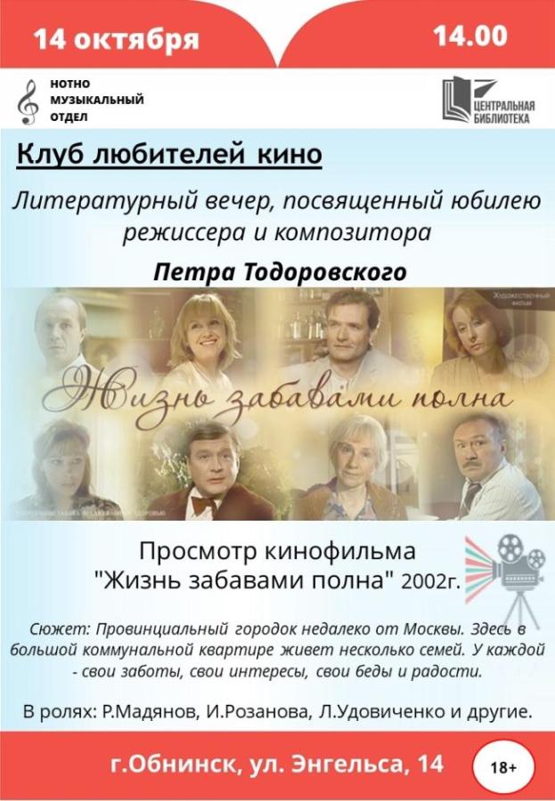 14 октября 2025 в 14:00 в нотно-музыкальном отделе Центральной библиотеки в Обнинске состоится встреча клуба любителей кино. Литературный вечер посвящён юбилею режиссера и композитора Петра Тодоровского. В программе просмотр кинофильма «Жизнь забавами полна» (2002). Сюжет: провинциальный городок недалеко от Москвы. Здесь в большой коммунальной квартире живет несколько семей. У каждой - свои заботы, свои интересы, свои беды и радости.