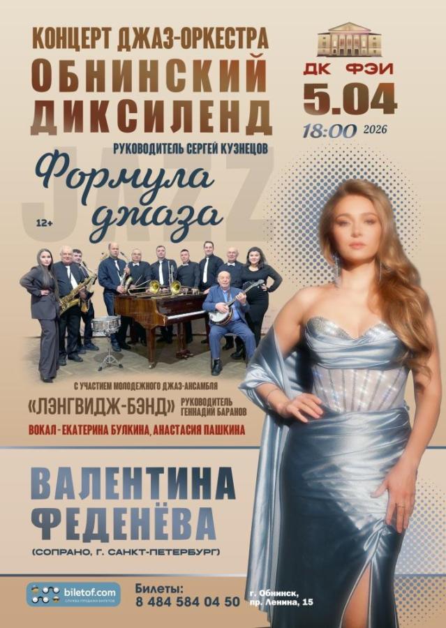 5 апреля 2026 в 18:00 в Доме культуры ФЭИ пройдёт концерт «Формула джаза» джаз‑оркестра «Обнинский диксиленд» под руководством Сергея Кузнецова.
