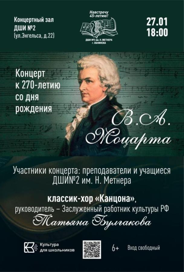 27 января 2026 в 18:00 в ДШИ №2 им. Н. Метнерв в Обнинске пройдёт концерт, посвящённый 270-летию Вольфганга Амадея Моцарта.