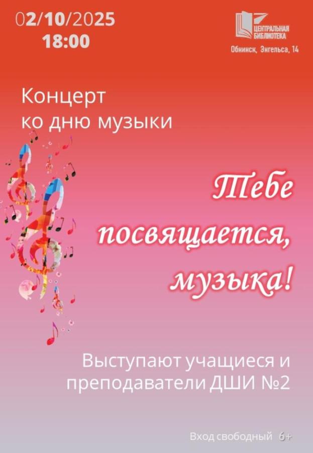 2 октября 2025 в 18:00 в Центральной библиотеке в Обнинске состоится концерт ко Дню музыки.