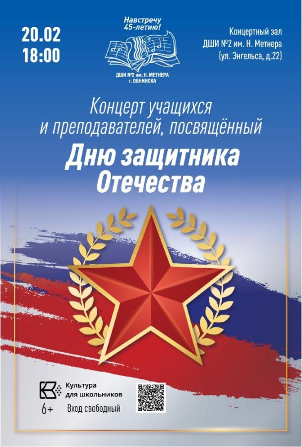 20 февраля 2026 в 18:00 в ДШИ №2 им. Н. Метнера в Обнинске состоится концерт, посвящённый Дню защитника Отечества.