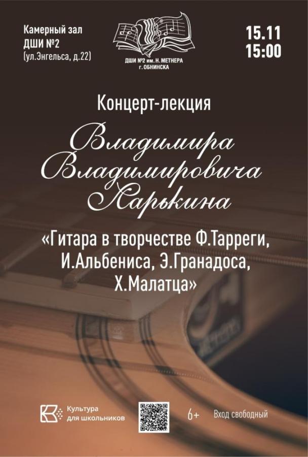 15 ноября 2025 в 15:00 в камерном зале детской школы искусств №2 им. Н. Метнера в Обнинске состоится концерт-лекция преподавателя народного отделения Владимира Владимировича Ларькина.