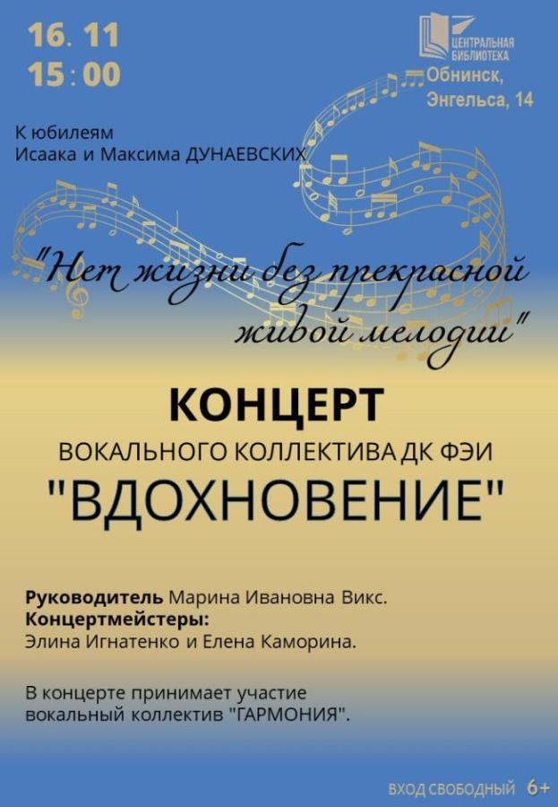 16 ноября 2025 в 15:00 в Центральной библиотеке в Обнинске пройдёт концерт «Нет жизни без прекрасной живой мелодии» вокального коллектива «Вдохновение».