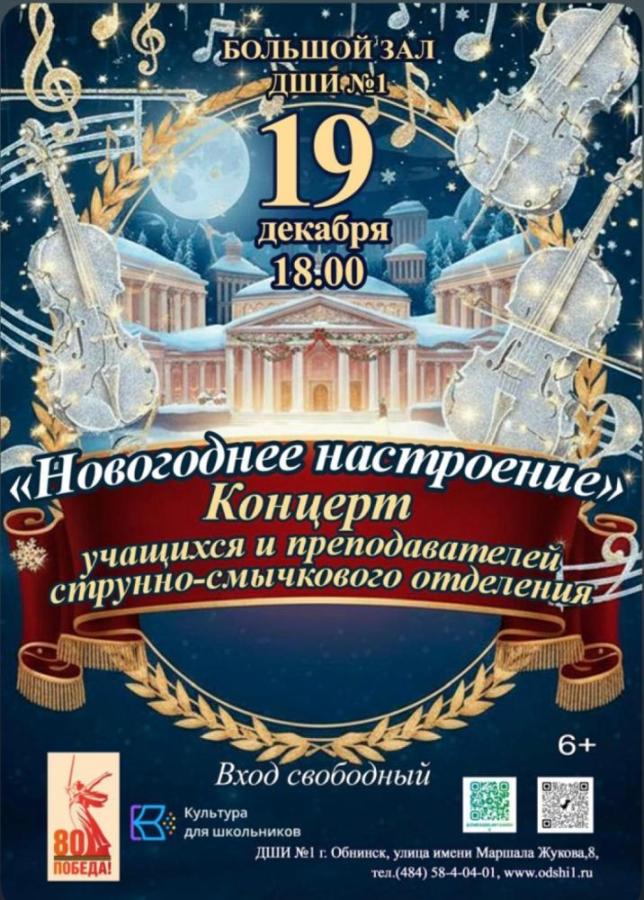 19 декабря 2025 в 18:00 в ДШИ №1 в Обнинске концерт «Новогоднее настроение». Выступают учащиеся и преподаватели струнно-смычкового отделения.