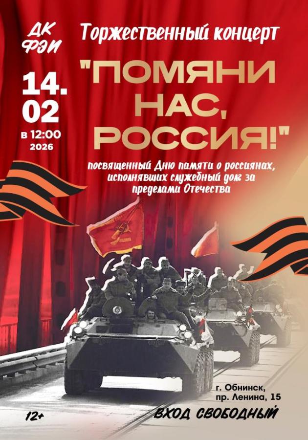 14 февраля 2026 в 12:00 в Дк ФЭИ пройдёт мторжественный концерт «Помяни нас, Россия!», посвящённый Дню памяти о россиянах, исполнивших служебный долг за пределами Отечества, и 37‑й годовщине вывода советских войск из Афганистана.
