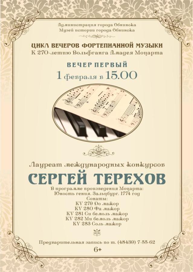 Сергей Дмитриевич является правнуком Виктора Петровича Обнинского, имя которого тесно связано с историей нашего города. Талантливый пианист уже много лет поддерживает дружеские связи с Обнинском, его хорошо здесь знают и всегда тепло встречают. В 2026 году в течении четырех вечеров Сергей Терехов будет исполнять произведения Вольфанга Амадея Моцарта.
