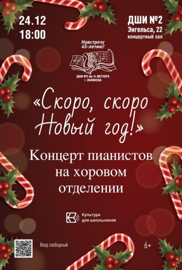 24 декабря 2025 в 18:00 в ДШИ №2 им. Н Метнера в Обнинске пройдёт новогодний концерт пианистов на хоровом отделении».