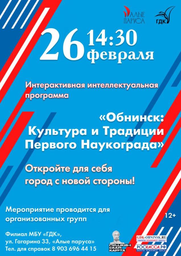 Мероприятия по «Пушкинской карте» проводятся по предварительной записи для организованных групп. Тел. для справок: +7 (903) 696-44-15 - https://gdk-obninsk.ru/.