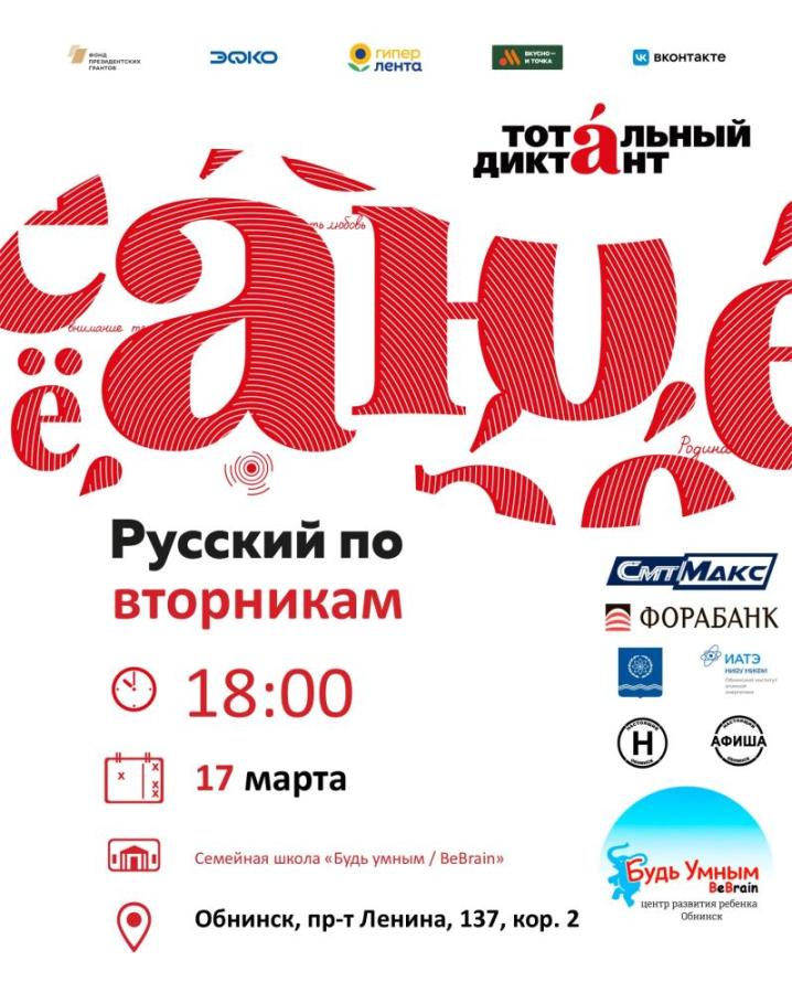 17 марта 2026 в 18:00 занятия пройдут в семейной школе «Будь умным / BeBrain». Регистрация на курсы — https://totaldict.ru/obninsk/#/events.