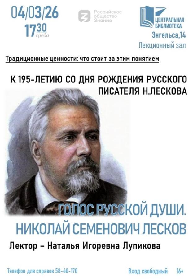 4 марта 2026 в 17:30 в Центральной библотеке состоится лекция к 195-летию со дня рождения русского писателя Н. Лескова.