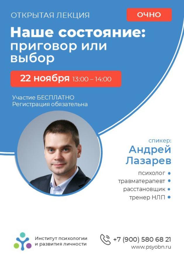 Институт психологии и развития личности приглашает 22 ноября 2025 с 13:00 до 14:00 на открытую лекцию «Наше состояние - приговор или выбор?».