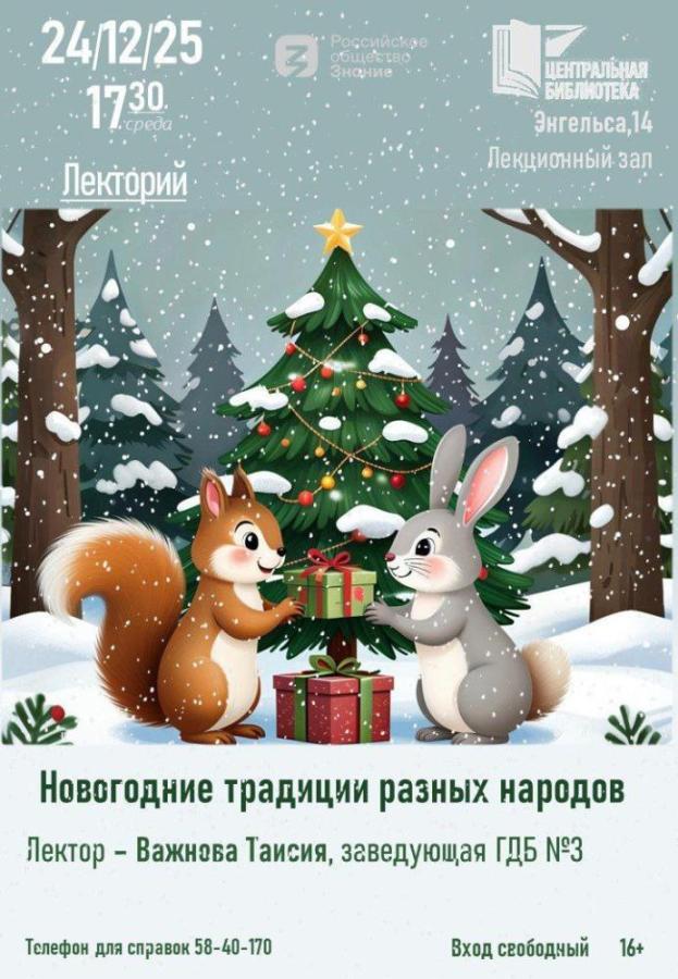 24 декабря 2025 в 17:30 в Центральной библиотеке в Обнинске пройдёт лекция Татьяны Важновой «Новогодних традиций разных народов».