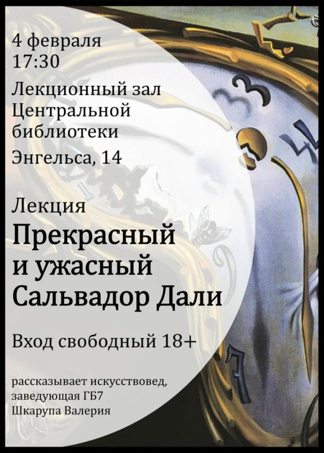 4 февраля 2026 в 17:30 в Центральной библиотеке в Обнинске пройдёт лекция «Прекрасный и ужасный Сальвадор Дали».