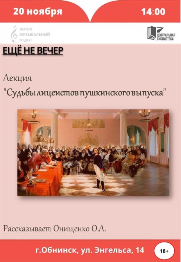 20 ноября 2025 в 14:00 в нотно-музыкальном отделе Центральной библиотеки в Обнинске состоится лекция «Судьбы лицеистов пушкинского выпуска». Лектор Онищенко О. Л.