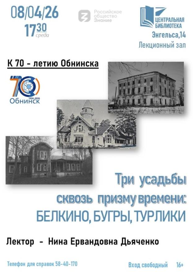 8 апреля 2026 в 17:30 в Центральной библиотеке состоится лекция «Три усадьбы сквозь призму времени: Белкино, Бугры, Турлики». Лектор Дьяченко Нина Ервандовна.