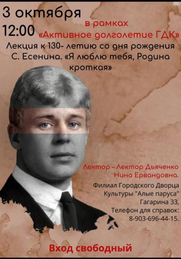 3 октября 2025 в 12:00 в ДК «Алые паруса» в Обнинске пройдёт лекция, посвящённая жизни и творчеству Сергея Есенина.