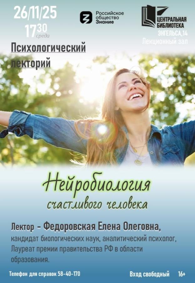 26 ноября 2025 в 17:30 в Центральной библиотеке в Обнинске состоится психологический лекторий «Нейробиология счастливого человека». Лектор Федоровская Елена Олеговна.