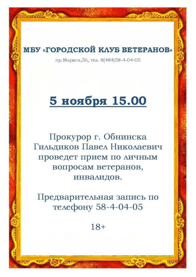 5 ноября 2025 в 15:00 в Городском клубе ветеранов в Обнинске состоится приём к прокурору Павлу Николаевичу Гильдикову. Предварительная запись по телефону: 8 (484) 584-04-05.