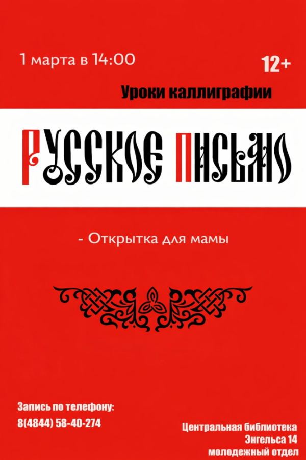 1 марта 2026 в 14:00 в Центральной библиотеке в Обнинске состоится мастер-класс «Открытка для мамы» в рамках уроков каллиграфии «Русское письмо».