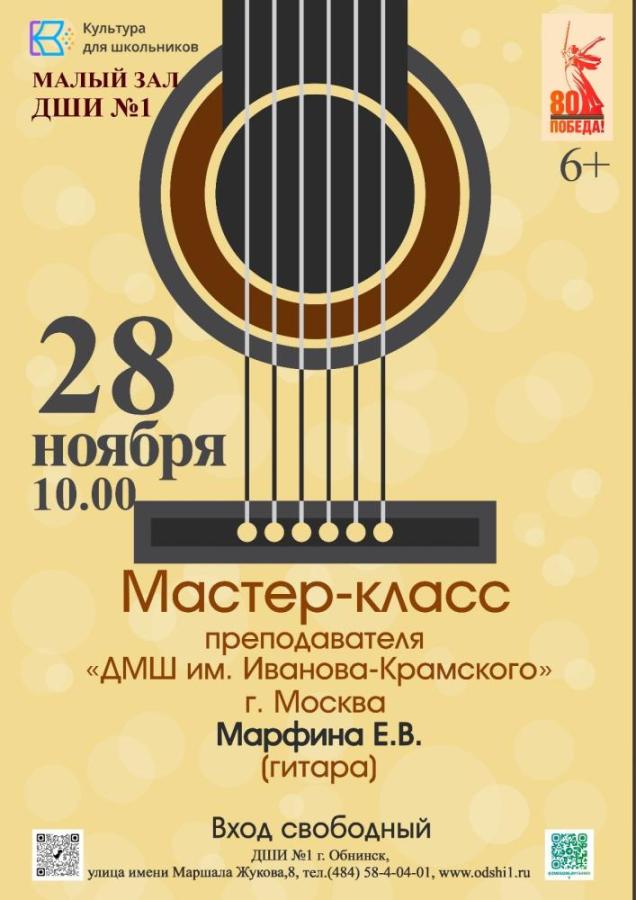 28 ноября 2025 в 10:00 в ДШИ №1 в Обнинске состоится мастер-класс преподавателя Марфина Е. В. (гитара) ДМШ им. Иванова-Крамского (Москва).