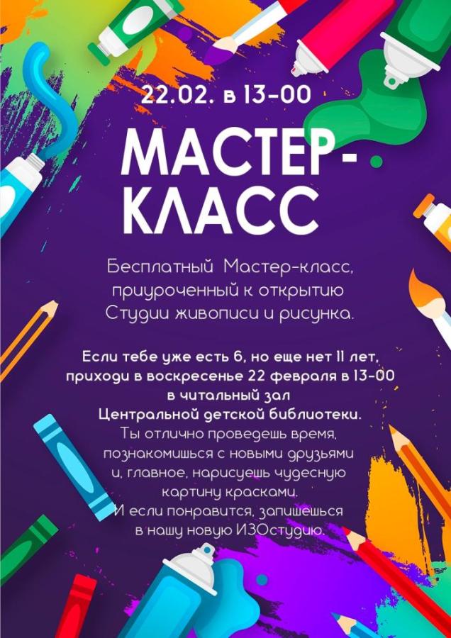 22 февраля 2026 в 13:00 в читальном зале Центральной библиотеки пройдёт бесплатный мастер-класс длядетей от 6 до 10 лет, приуроченный к открытию студии живописи и рисунка.