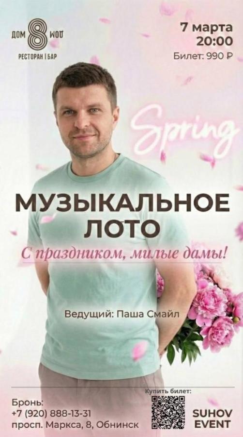 7 марта 2026 в 20:00 в ресторане 1ом восемь» в Обнинске пройдёт игра «Музыкальное лото» к 8 Марта.