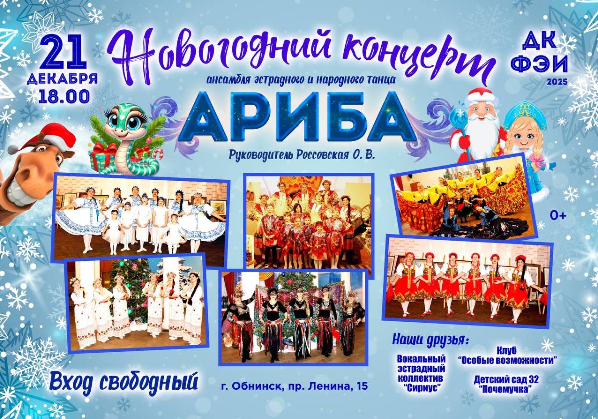 21 декабря 2025 в 18:00 в ДК ФЭИ состоится новогодний концерт ансамбля эстрадного и народного танца «Ариба». Руководитель Ольга Владимировна Россовская. На сцене засияют красочные номера, где гармонично сплетутся традиции народного танца, современные ритмы и вокальные номера — всё это создаст незабываемое зрелище, полное динамики, красоты и новогоднего очарования.