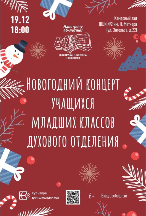 19 декабря 2025 в 18:00 в ДШИ №2 им. Н. Метнера в Обнинске пройдёт новогодний концерт учащихся младших классов духового отделения.