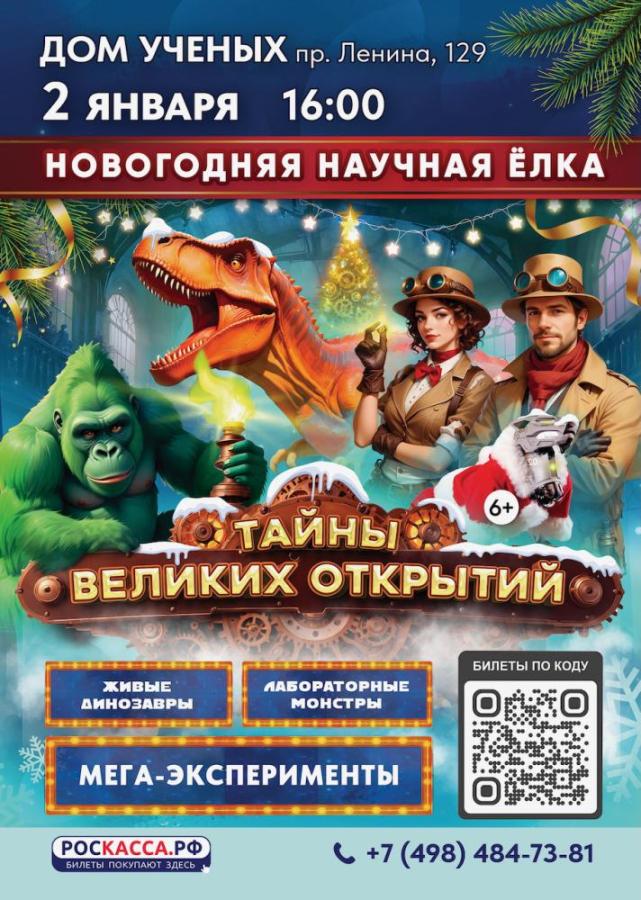 «Тайны Великих Открытий» — новогодняя научная ёлка для всей семьи! Это праздничное шоу, созданное специально для современных детей и родителей: уникальное сочетание новогоднего волшебства, науки и ярких героев, которое полностью погружает зрителей в атмосферу чудес. Зрителей ждёт увлекательное приключение вместе с Профессором Грюмом и его помощницей Шушу. Они продемонстрируют масштабные крио эксперименты, раскроют тайны великих изобретений и перенесут всех в эпоху Юрского периода, где живут настоящие 4-х метровые динозавры! На сцене и в зале появятся живые динозавры, дружелюбный робот-пёс Кибер, величественная Горилла Конго и загадочный лабораторный монстр.