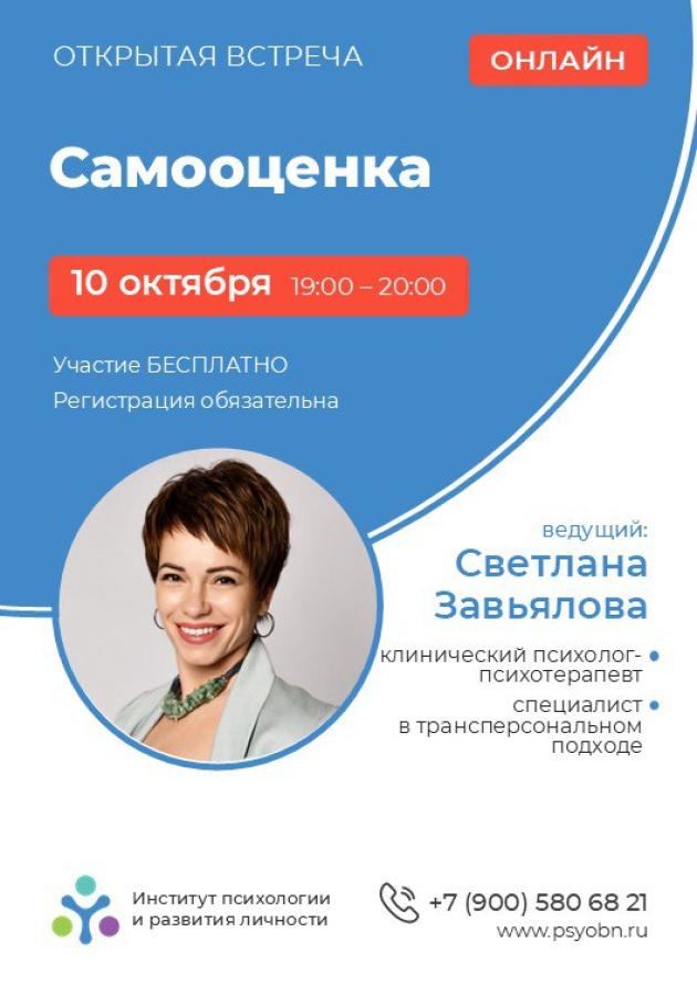 Институт психологии и развития личности приглашает 10 октября 2025 с 19:00 до 20:00 на открытую онлайн-встречу с психологом «Самооценка».