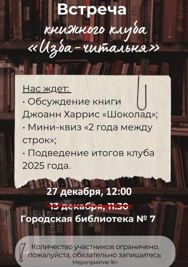 27 декабря 2025 в 12:00 в библиотеке №7 в Доме учёных состоится встреча книжного клуба «Изба-читальня». Группа клуба в Телеграм - https://t.me/izbaobninsk.
