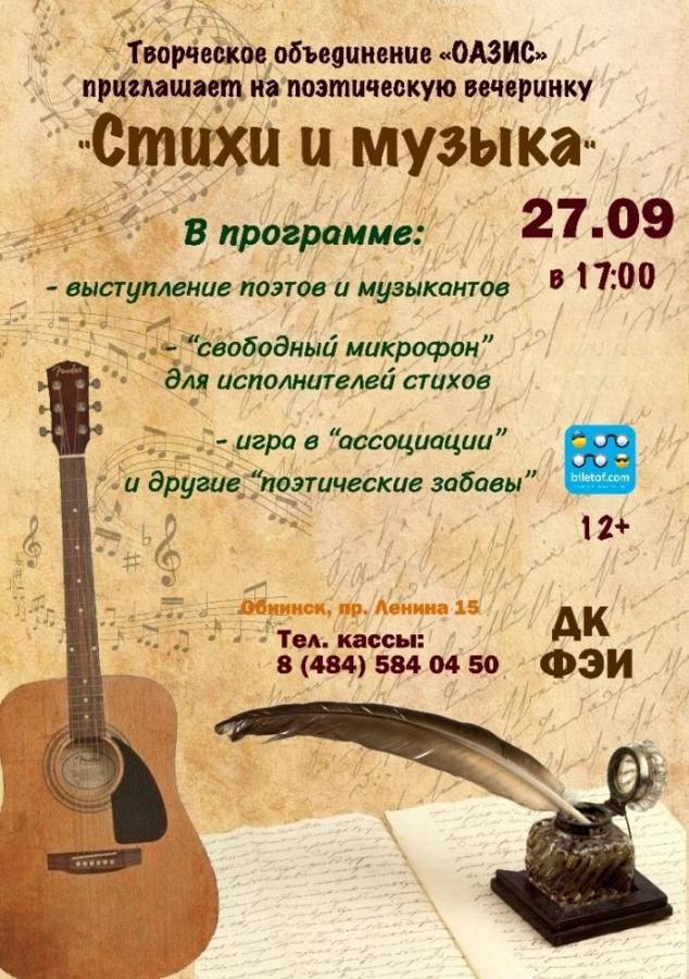 27 сентября 2025 в 17:00 в ДК ФЭИ в Обнинске творческое объединение «ОАЗИС» приглашает всех на поэтическую вечеринку «Стихи и музыка».