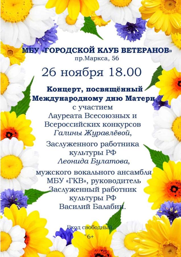 В преддверии Международного дня матери 26 ноября 2025 в 18:00 в Городском клубе ветеранов пройдёт концерт. Вы услышите любимые песни в исполнении Лауреата Всесоюзных и Всероссийских конкурсов вокалистов, солистки города Галины Алексеевны Журавлёвой под аккомпанемент Заслуженного работника культуры Российской Федерации, заведующего отделом и преподавателем МБУ ДО "Детская музыкальная школа N 1, г. Обнинска" Леонида Леонидовича Булатова.
