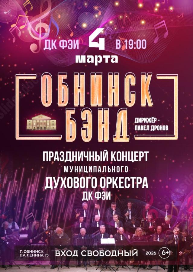 4 марта 2026 в 19:00 ДК ФЭИ распахнёт свои двери для всех любителей живого звука. Муниципальный духовой оркестр «Дома культуры ФЭИ» в преддверии Международного женского дня приглашает вас на праздничный концерт с новой программой «Обнинск бэнд».