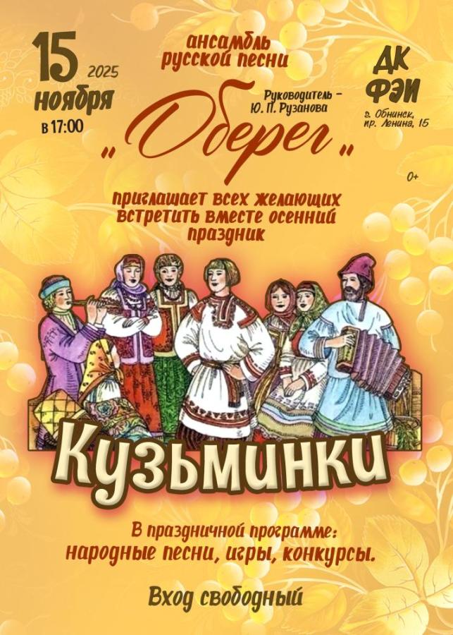 15 ноября 2025 в 17:00 в МАУ «ДК ФЭИ» пройдёт осенний праздник «Кузьминки». Ансамбль русской песни «Оберег» подготовил для гостей замечательную программу, наполненную народными песнями, весёлыми играми и увлекательными конкурсами.