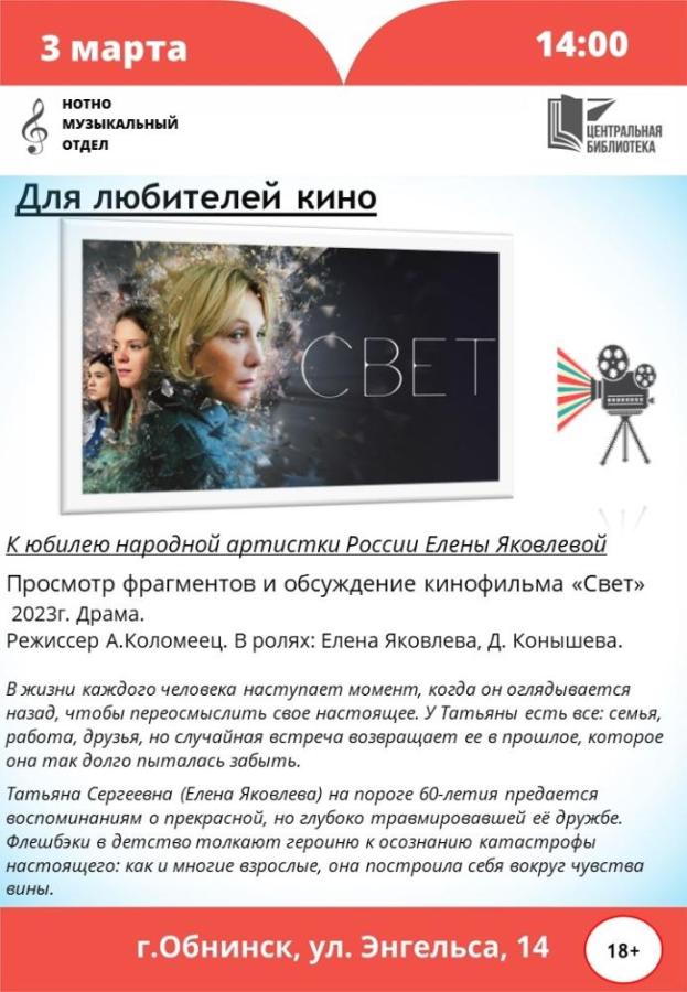 3 марта 2026 в 14:00 в Центральной библиотеке Обнинска состоится просмотр фрагментов и обсуждение фильма «Свет» (2023г.).