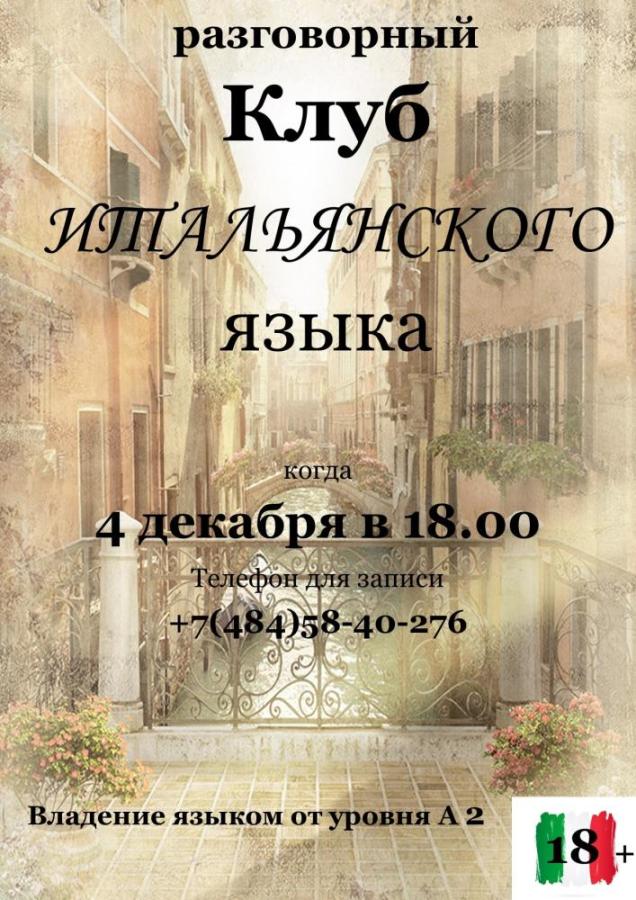 4 декабря 2025 в 18:00 в читальном зале Центральной библиотеки состоится встреча разговорного клуба итальянского языка. Встречи не являются уроками. Цель - общение на итальянском языке для поддержания разговорной речи. Не важно, как это у вас получается.