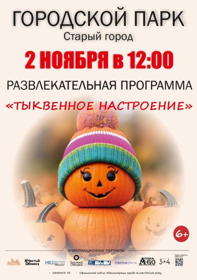 2 ноября 2025 в 12:00 в Городском парке Обнинска состоится развлекательная программа «Тыквенное настроение».
