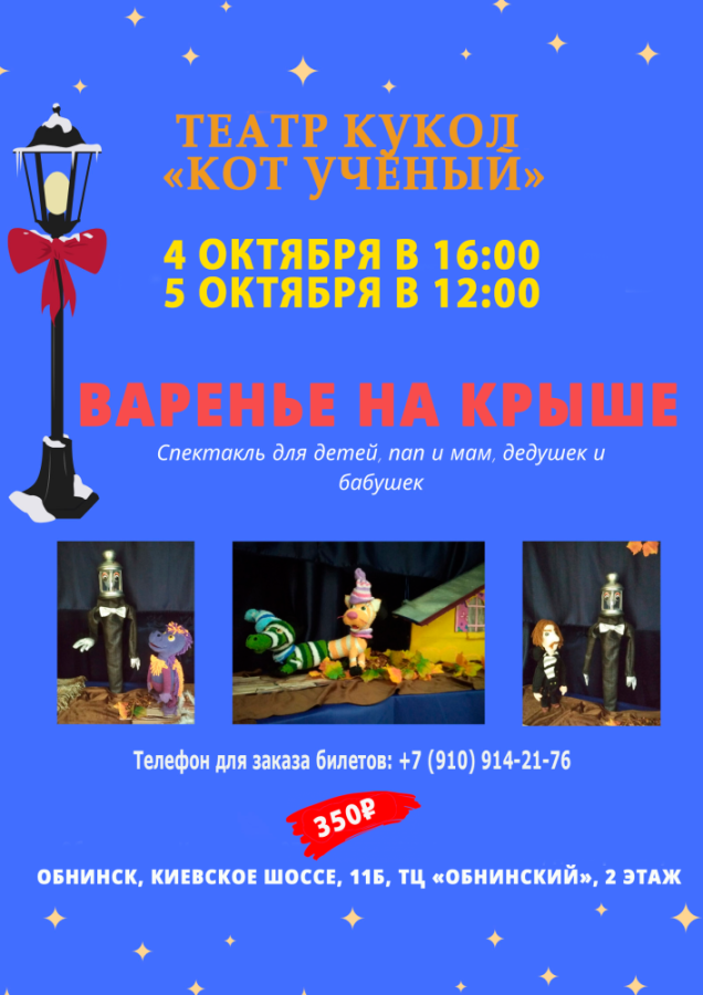 Продолжительность спектаклей 35-45 минут. После спектакля можно сфотографироваться с куклами! Перед спектаклем Кот Учёный с удовольствием поздравит своего маленького зрителя с днём рождения (бесплатно).