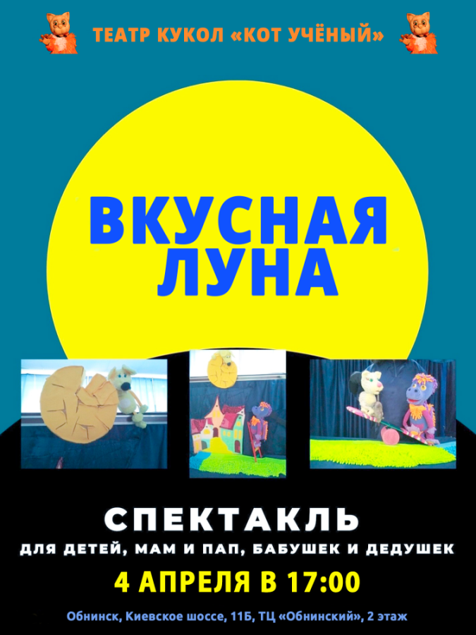 4 апреля 2026 в 17:00 театр кукол «Кот Учёный» в Обнинске приглашает на спектакль для детей, их пап и мам, бабушек и дедушек «Вкусная луна» (4+).