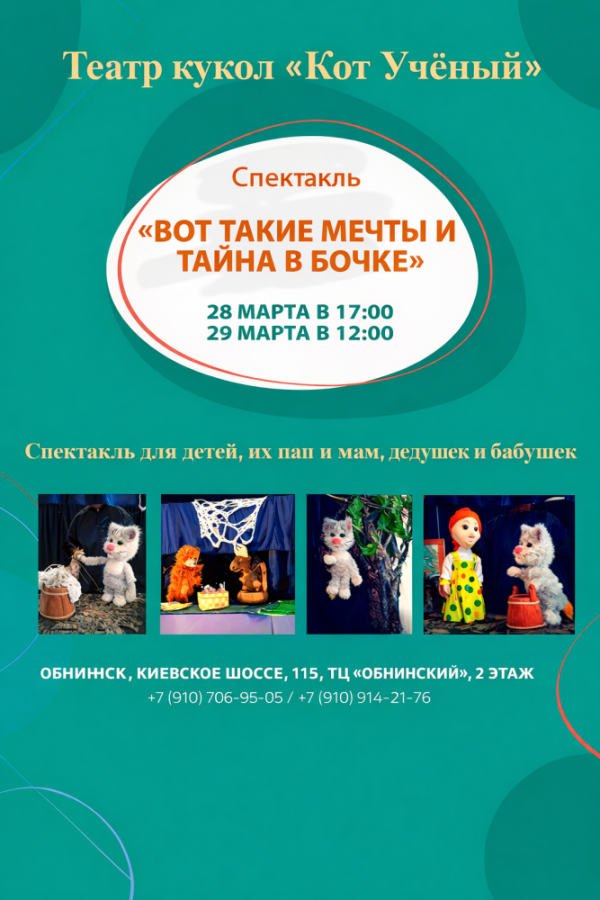 Продолжительность спектаклей 35-45 минут. После спектакля можно сфотографироваться с куклами! Перед спектаклем Кот Учёный с удовольствием поздравит своего маленького зрителя с днём рождения (бесплатно).