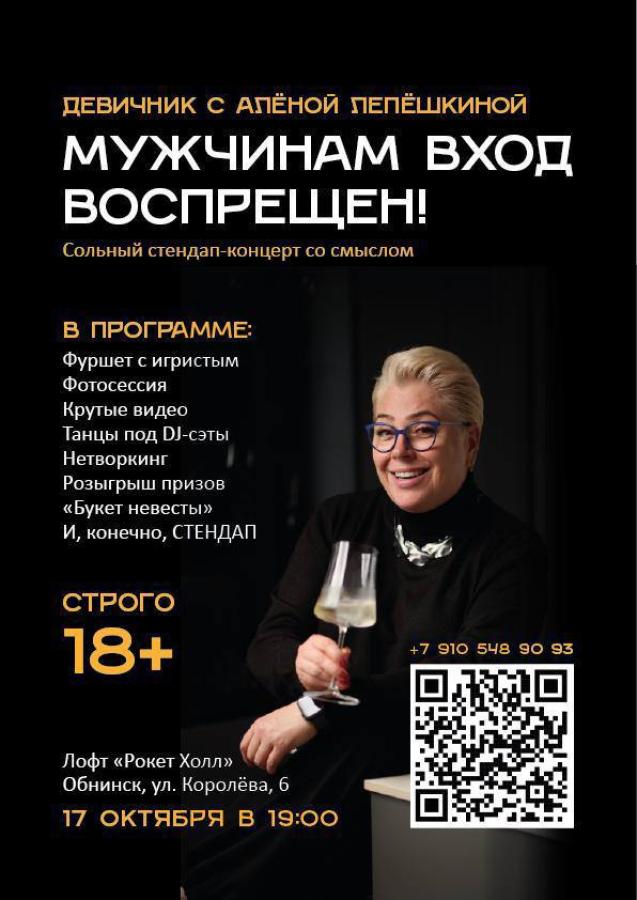 17 октября 2025 в 19:00 в лофте «Рокет Холл» в Обнинске пройдёт стендап-девичник с Алёной Лепёшкиной в Обнинске, на котором не стыдно смеяться. Мужчинам вход запрещён.